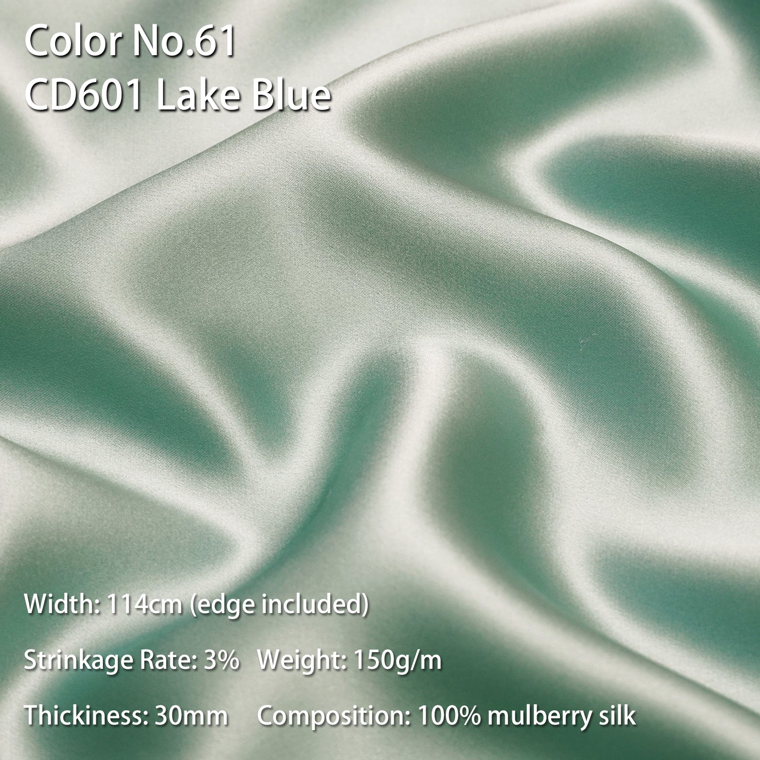 - Width: 114 cm Thickness: 30 momme Composition: 100% Mulberry Silk