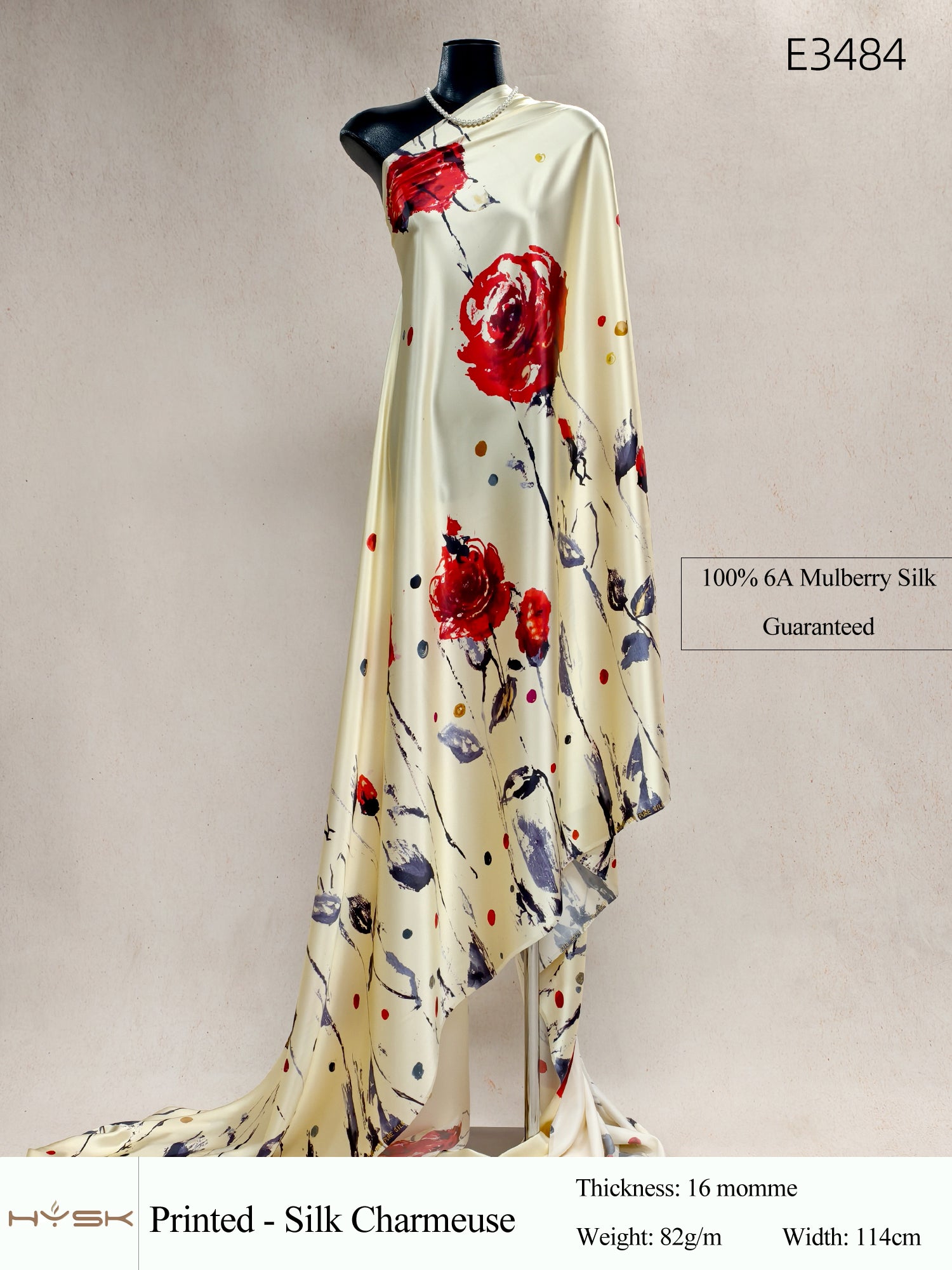 HYSK Digital Printed 100% Mulberry Silk Charmeuse – 16 Momme, 114cm Width, 6A Grade Silk Original Design Fabric for Couture, Evening Wear & Traditional Attire